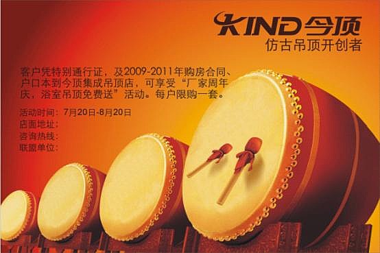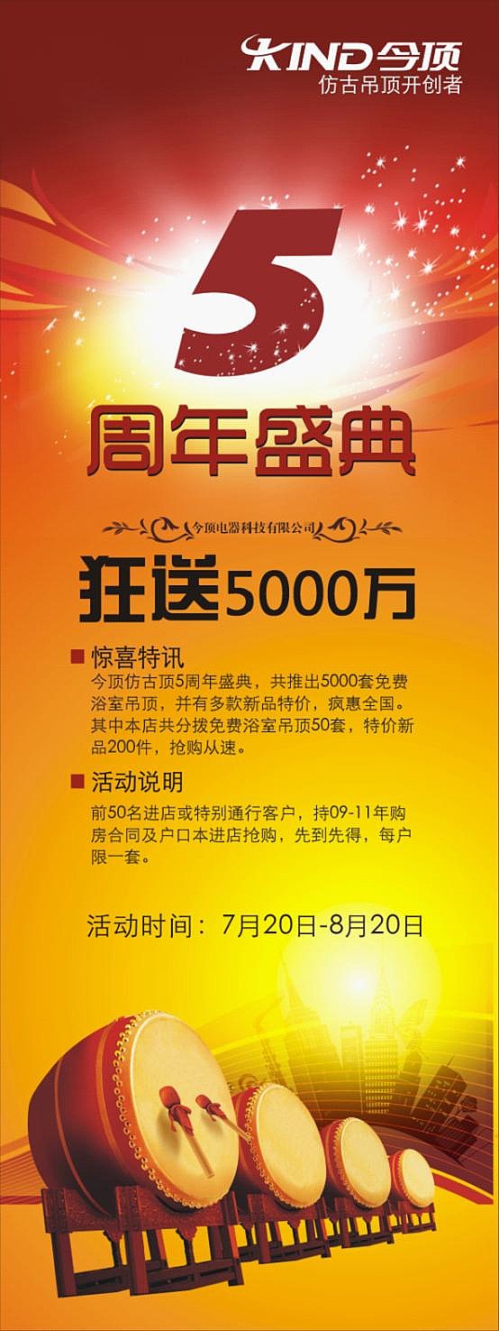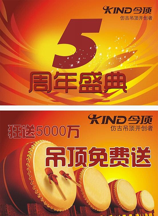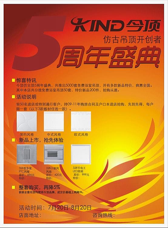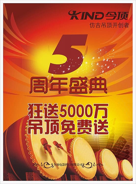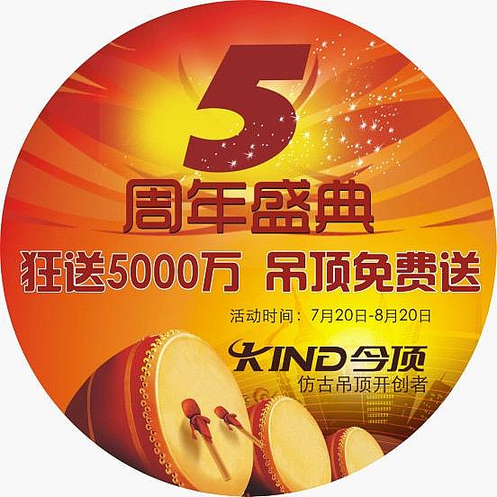 為慶祝今頂集成吊頂公司成立5周年,同時近期榮獲《行業(yè)推薦品牌》、《誠信品牌》等榮譽(yù)稱號,今頂廠家特推出“輝煌5周年,狂送5000萬”全國大型促銷活動。