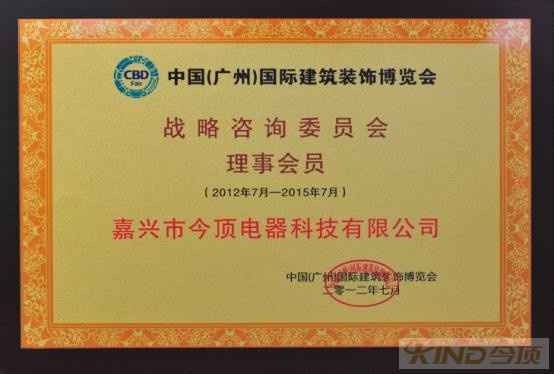 近日,嘉興市今頂電器科技有限公司被列入中國(廣州)國際建材裝飾博覽會戰(zhàn)略咨詢委員會理事會員單位并正式收到頒發(fā)的《廣州建博會戰(zhàn)略咨詢委員會理事會員證書》榮譽銅牌。