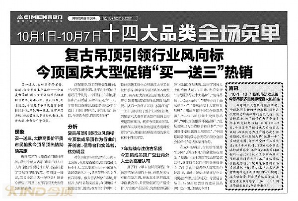 近日,《海峽都市報》發(fā)表了關(guān)于今頂復(fù)古集成吊頂福州專賣店國慶促銷活動的文章《今頂復(fù)古吊頂引領(lǐng)行業(yè)風(fēng)向標(biāo)——福州今頂國慶大型促銷“買一送三”熱銷》的報導(dǎo)。詳文如下: