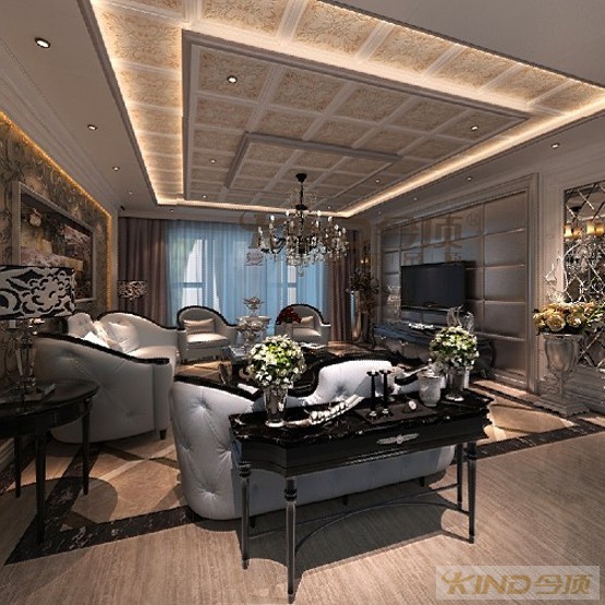 在將這款古典風格強烈的天花板塊具體運用到家居時,設計師進行了一定的改造,將整個客廳空間采用三級錯層的方式,周邊搭配淺色板材及配套邊條橫梁,突出與中央地帶的對比;并點綴以一盞豪華的水晶吊燈,充分營造出歐式奢華的感覺,將歐式風格展現(xiàn)得淋漓盡致。奠定了整體空間裝飾的富麗堂皇,彰顯出主人典雅非凡的生活品位。