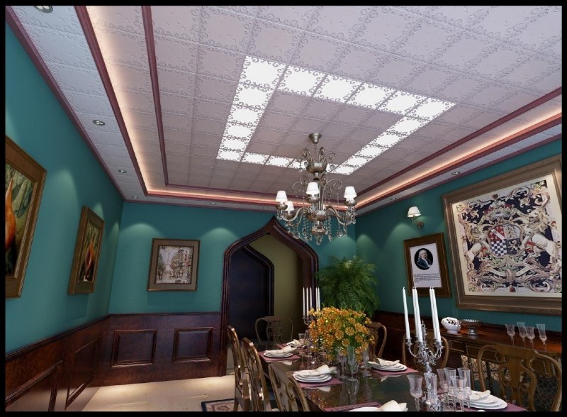 在超過350平米的超大展出空間里,今頂實(shí)景模擬展出與別墅空間同比例的入戶門廳、餐廚、客廳、書房、陽臺等五大空間,并且以豐富的軟裝來裝飾整個(gè)空間,大到家具沙發(fā),小到裝飾壁畫都力求真實(shí)還原,令步入展廳的參觀者身臨其境的體驗(yàn)復(fù)古吊頂在家居空間中的真實(shí)場景。在餐廚一體空間,通過色澤厚重、立體紋飾的“匠●坊”系列將美式風(fēng)格的粗獷與古樸進(jìn)行溫馨演繹。而中式空間,則以行云流水的書法字畫與窗格造型的頂飾傳承中式復(fù)古的文化底蘊(yùn)。