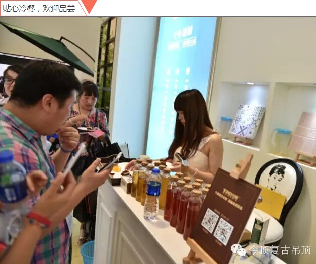 為了提供更好觀展體驗,今頂復古吊頂現(xiàn)場設置模特演繹,微信掃碼贈送飲品、免費提供冷餐等內(nèi)容,吸引眾多意向客戶停留休息。