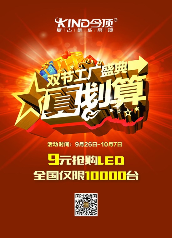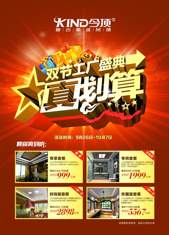 又到金九銀十裝修旺季,今頂復(fù)古集成吊頂全國1000多家專賣店將同期開展,中秋、國慶“雙節(jié)工廠盛典,真劃算”聯(lián)動終端促銷活動,與您共創(chuàng)高端、優(yōu)質(zhì)家居生活。
