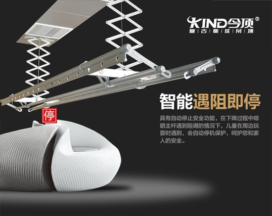 今頂集成吊頂開發(fā)的智能晾衣架,擁有優(yōu)秀的安全性能,有效預(yù)防晾衣過程中產(chǎn)生的安全隱患。它還具有超強(qiáng)的干衣功能!不用到室外曬晾衣物,不必?fù)?dān)心白天和黑夜,也不必?fù)?dān)心陰雨和霧霾,都可以洗滌完晾曬,更有效地利用時間,對現(xiàn)在的忙碌的上班族非常適合。晾衣架在下降過程中,遇到障礙物自動停止運(yùn)行,避免了鋼絲拉繩錯位,導(dǎo)致機(jī)身鋼繩紊亂!