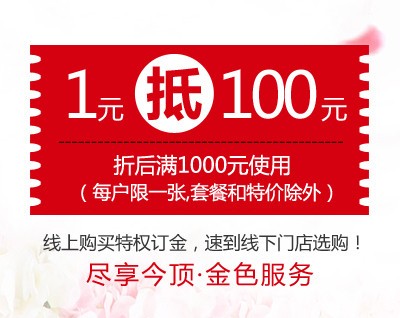 1元抵100元;今頂天貓旗艦店拍1元特權(quán)訂金,線下可抵100元(需折后滿1000元,每戶限1張,套餐和特價(jià)除外)