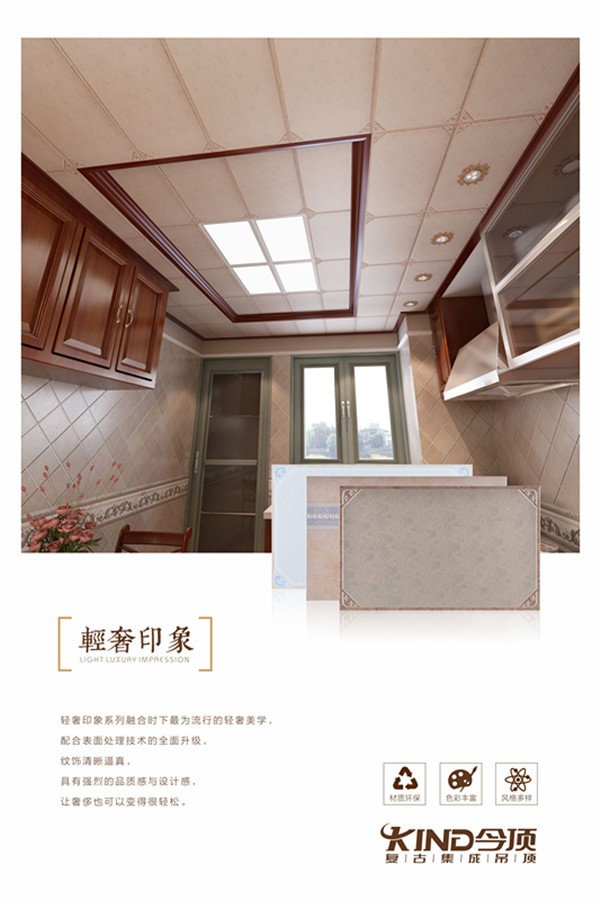 本次“輕奢印象”系列是2016年今頂集成吊頂春季新品“尊雅系列”持續(xù)性延伸產(chǎn)品。依舊采用今頂集成吊頂獨特氧化及絲印工藝,抗紫外線、色彩均勻一致、紋理清晰逼真、不褪色,健康環(huán)保!獨具特色的是將板材拉長,300*485全新出擊,打破集成吊頂傳統(tǒng)板材方正理念,讓家的天空拼接有更多的選擇,讓消費(fèi)者成為藝術(shù)的創(chuàng)造者。同時,本系列簡約時尚輕奢華,配以花紋點綴,真實肌理紋路突顯文化沉淀,在光的瞬息萬變中揭示著自然界的奧妙,給人一種自然簡約又復(fù)古的基調(diào)。