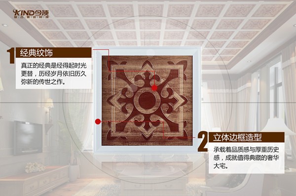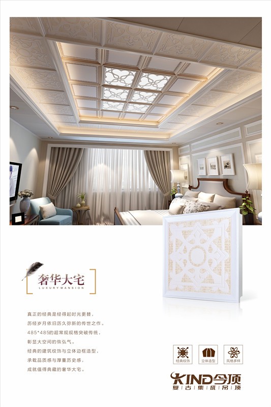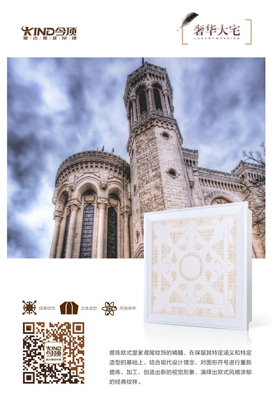 以經(jīng)典和奢華為主題融入經(jīng)典建筑藝術元素,今頂復古集成吊頂“奢華大宅系列”,迎合精益求精的工匠精神,高品質打造出0.7mm加厚板材。通過對傳統(tǒng)徽派建筑窗格圖形的提煉、組織和運用,構圖上追求對稱、均衡與穩(wěn)定,喚起人們對徽派建筑的回憶,中心為美的思想引起強烈審美共鳴,體現(xiàn)家居生活深厚的文化內涵。提煉歐洲經(jīng)典藝術文化,結合現(xiàn)代設計理念,創(chuàng)造出新的視覺立體形象,演繹出歐式風格濃郁的經(jīng)典紋樣。拋棄過多繁復的刻意修飾,以簡約經(jīng)典的藝術形態(tài)呈現(xiàn)豐富多彩的“奢華大宅”系列。