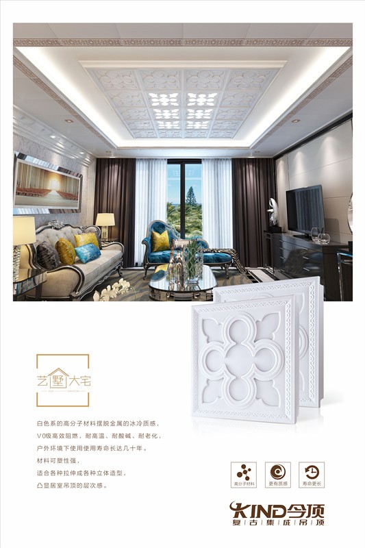 今頂集成吊頂“藝墅大宅”系列板材及LED照明春季新品藝術(shù)上市!本次今頂集成吊頂采用新型環(huán)保高分子材料,表現(xiàn)藝術(shù)感的同時,適應(yīng)現(xiàn)代裝修的潮流,兼顧室內(nèi)家居環(huán)保。汲取歐洲古典建筑藝術(shù)美學(xué)的精華,融入大自然豐富多彩的元素,打造極具藝術(shù)感的板材及照明。力求把歐洲最經(jīng)典的建筑元素融入進產(chǎn)品中,將實用性和審美性相結(jié)合,讓家的天空更具文化價值和審美價值。浮雕般的視覺呈現(xiàn),塑造出來的圖案更好像出現(xiàn)幻動感,隨著不同欣賞位置的變動,都能給人一種立體真實的感覺,富有層次感。