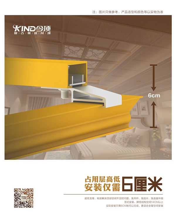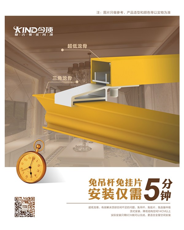 今頂超低龍骨實(shí)際只需6CM就可以完成安裝,更適合全屋空間安裝。其安裝快捷,節(jié)省層高,結(jié)構(gòu)穩(wěn)定,自由調(diào)節(jié)等諸多優(yōu)點(diǎn),加快了集成吊頂行業(yè)全屋化的腳步。