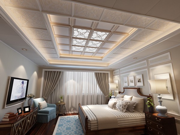 整體方案采用三級(jí)吊頂層層遞進(jìn)模式,中央?yún)^(qū)域采用立體邊框造型板和一體錯(cuò)層結(jié)構(gòu),呈現(xiàn)一種奢華大氣的視覺(jué)體驗(yàn)。對(duì)于臥室而言,最不能缺少的就是浪漫情調(diào),外凸純白色高分子鑲嵌造型的LED照明,為臥室空間增添一抹亮色。