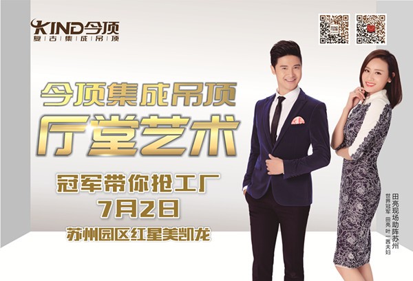 7月2日,蘇州園區(qū)紅星美凱龍,廳堂藝術(shù),今頂1號客廳新品發(fā)布會,跳水冠軍田亮帶你搶工廠!今頂集成吊頂重金邀請?zhí)谲娞锪粒瑪y手紅星美凱龍共同打造今頂集成吊頂夏日家裝盛典,激情時刻,即將燃情揭幕。