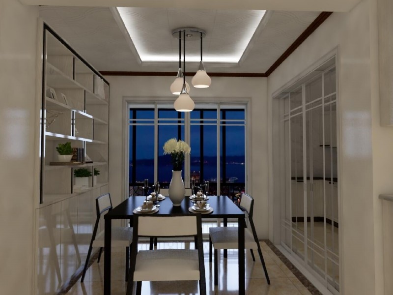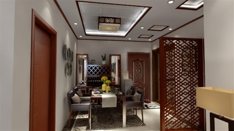 家人的和睦,配上今頂?shù)闹惺降蹴敚谝患胰藞F團圓圓、闔家歡樂、共進美食的餐廳里,氣氛異常歡快。所以,餐廳吊頂采用的是古韻板材和木色邊條相互搭配,中間并做往里凹的處理,加以中式吊頂使得凹凸有致,層次更加分明,一系列的結(jié)合象征著一家老小團圓幸福,意義深重。餐桌也是采用了現(xiàn)代款深色方形臺面,與頂部互相輝映。
