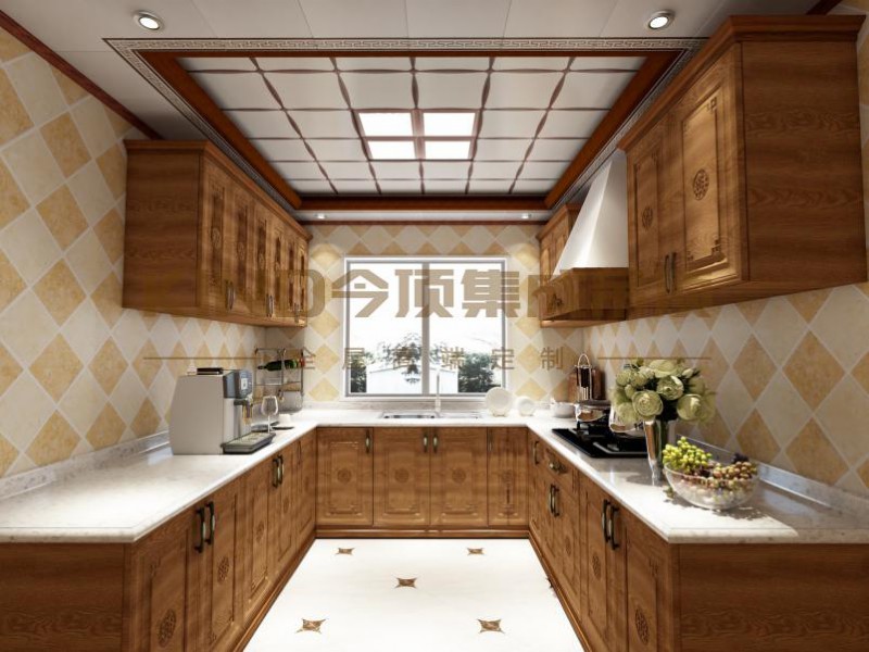 中式給人的感覺是穩(wěn)重,帶有中國傳統(tǒng)紋飾的頂面與櫥柜毫不掩飾的展現(xiàn)這一魅力。吸頂燈給予廚房充足的光線,也避開了中式容易給人壓抑感的雷區(qū)。