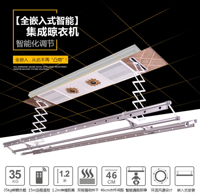 智能晾衣機(jī)一般都是安裝在頂部,且為全嵌入式安裝,比起落地式晾衣架,不僅不占地面空間,還擁有35kg超強(qiáng)承重,簡(jiǎn)潔又實(shí)用。