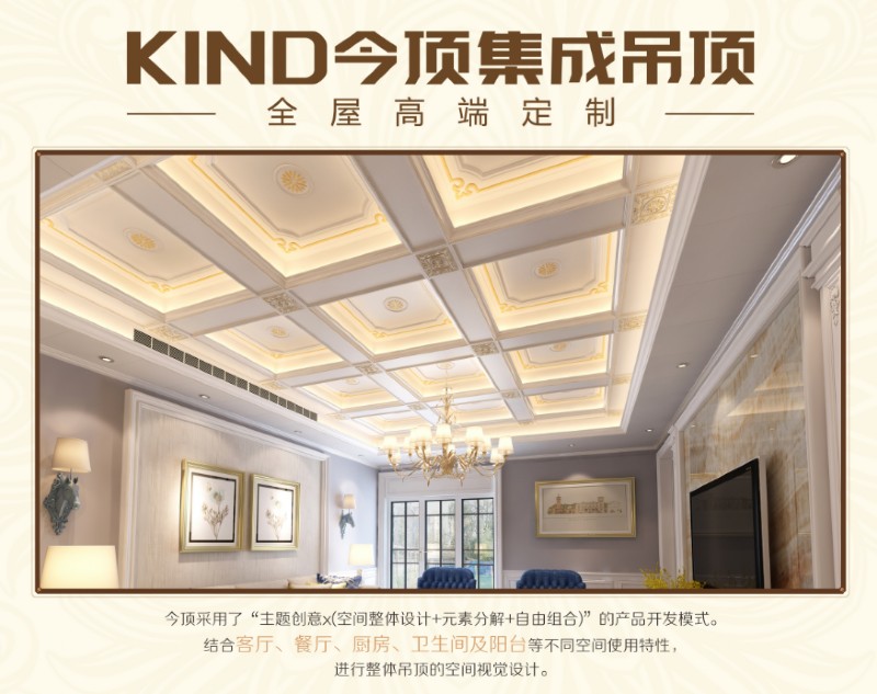 今頂全屋吊頂采用了“主題創(chuàng)意x(空間整體設(shè)計+元素分解+自由組合)”的產(chǎn)品開發(fā)模式,結(jié)合客廳、餐廳、廚房、衛(wèi)生間等不同空間使用特性,進(jìn)行整體吊頂?shù)目臻g視覺設(shè)計,可大幅提升居室的裝修效果,彌補(bǔ)石膏頂不上檔次,不夠大氣的缺點(diǎn)。
