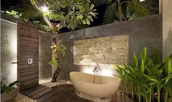 放飛自我型:自己有院子有圍墻的前提下,修這么一個半開放式的浴室,洗澡的時候跟直接幕天席地也差不離了!貼近自然,放飛自己,這一刻,我不是凡人,我是大自然的精靈!