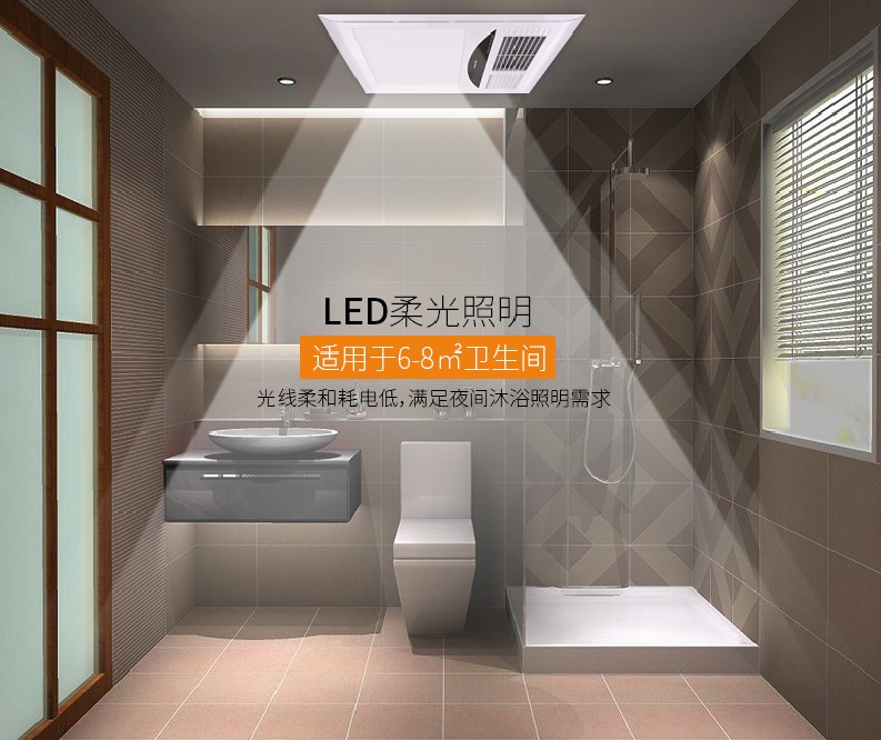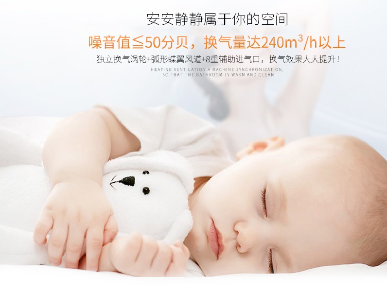 獨(dú)立換氣渦輪+弧形蝶翼風(fēng)道+8重輔助進(jìn)氣口,噪音值低于50分貝,換氣量達(dá)240m3/h以上,靜享浴室美妙時(shí)光。