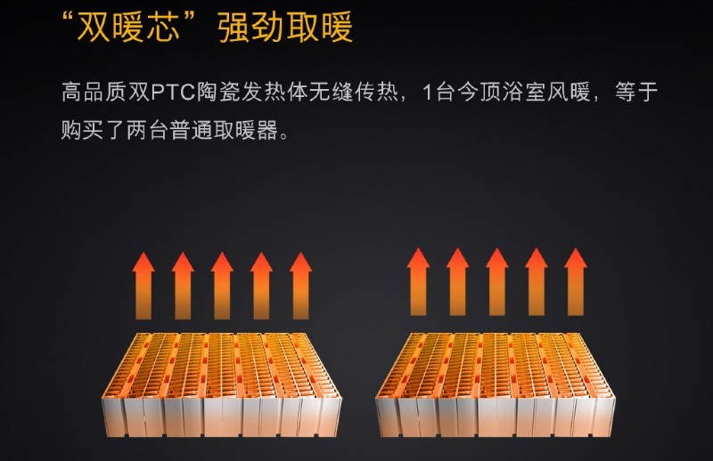 今頂浴室風(fēng)暖采用與中央空調(diào)同等工藝的雙PTC模塊與阿基米德螺旋風(fēng)道,1s即速熱風(fēng),3分鐘讓浴室達(dá)到最舒適的體感溫度,取暖效果一個(gè)頂倆!