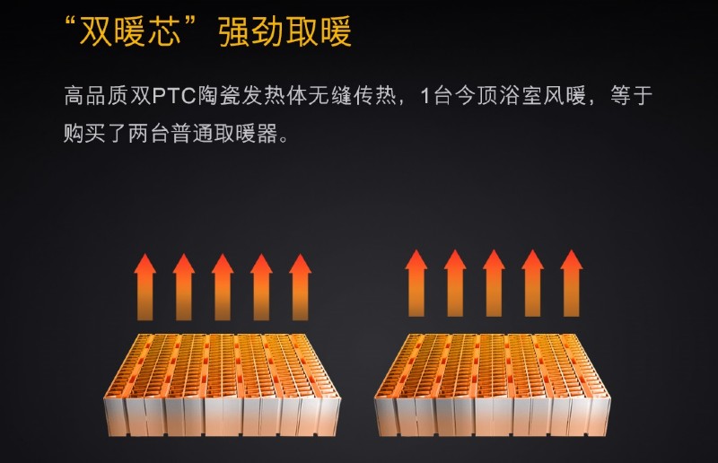 2組獨立PTC發(fā)熱體,熱阻小,換熱效率高;對比普通的暖風機單PTC發(fā)熱,發(fā)熱效率提升2倍。1臺今頂浴室風暖>2臺普通衛(wèi)浴取暖器!