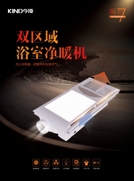 今頂暖尊7通過(guò)雙電機(jī)雙核動(dòng)力、一鍵切換旋轉(zhuǎn)風(fēng)門(mén)、生態(tài)級(jí)負(fù)離子生成等三大核心技術(shù),實(shí)現(xiàn)了LED照明、沐浴暖風(fēng)、沐浴涼風(fēng)、洗漱暖風(fēng)、洗漱涼風(fēng)、干衣干房、空氣凈化等10大功能,既是干濕分區(qū)跨界的取暖器,又是浴室空氣凈化器。