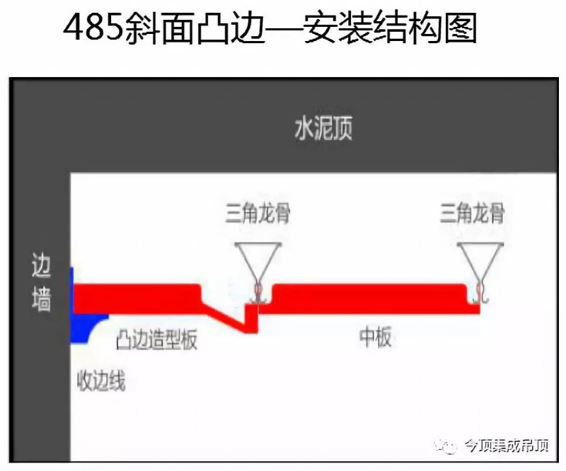 通過凸邊造型板的安裝(直接卡入三角龍骨,無需任何配件),可以達到1.6cm微錯層的落差效果(裝飾條落差約0.5cm)。