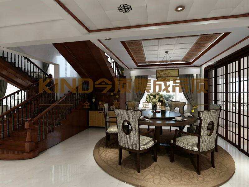 客廳吊頂選用了今頂“1號(hào)客廳”系列中的“書(shū)香門(mén)第”,超大規(guī)格板材大氣雅致,紅棕色澤與深棕色洞窗屏風(fēng)、棕色大門(mén)形成漸變的視覺(jué)效果,又有淺色地磚為底,搭配素雅的軟裝家具,舒適大方,質(zhì)感別具。