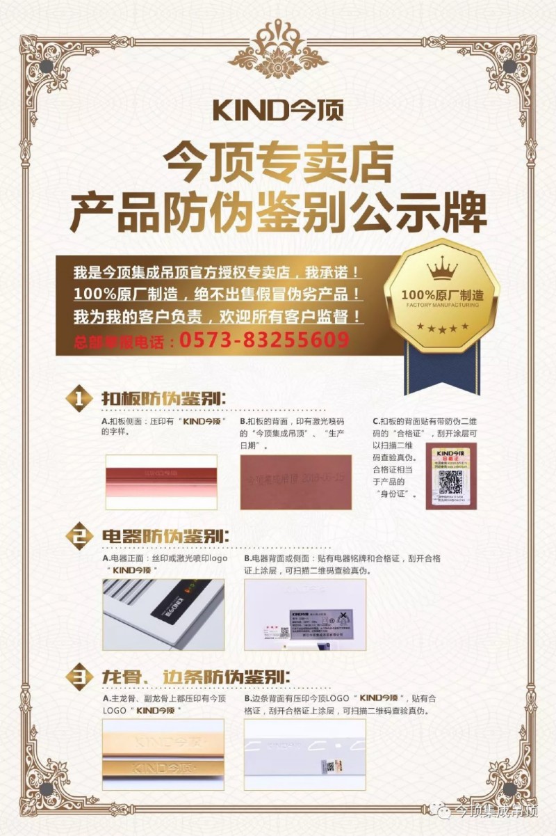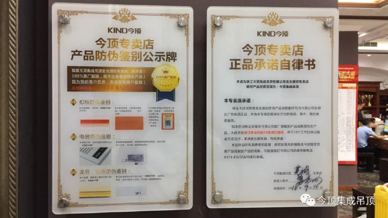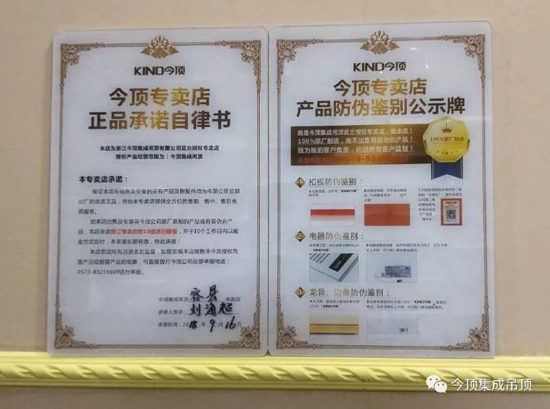 秉承著“金色服務(wù),永不打折”的服務(wù)理念,日前,浙江今頂集成吊頂有限公司向全國(guó)代理商配發(fā)了《正品承諾自律書(shū)》、《今頂正品鑒別公示牌》等物料,要求全國(guó)眾多門店展示于店面醒目之處,做出統(tǒng)一的正品承諾,為消費(fèi)者營(yíng)造放心的購(gòu)物環(huán)境。
