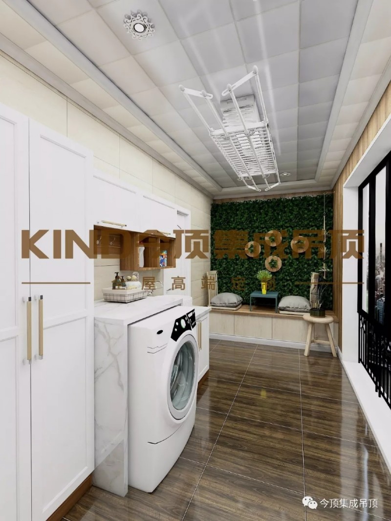 你也可以把洗衣臺更換成吊柜或吊籃,收納日常的清潔用品,養(yǎng)些花花草草也是極好的。