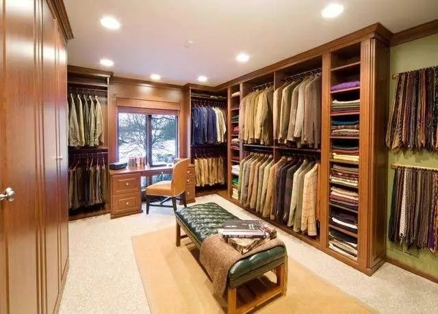 步入式衣帽間是除儲(chǔ)物柜外,一般還包含梳妝臺(tái)、更衣鏡、取物梯子、燙衣板、衣被架、座椅等設(shè)施。