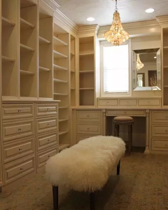 獨(dú)立式衣帽間儲(chǔ)存空間完整,但是對(duì)住宅面積要求較高,要求房間內(nèi)照明充足。這種就是從小女孩們看電影時(shí),女主角擁有的那種衣帽間啊!心愛的衣服、鞋子、包包擺放整齊,公主風(fēng)的梳妝臺(tái)上化妝品、飾品精致而優(yōu)雅,這一方小小天地簡(jiǎn)直滿足了愛美女生的所有幻想。