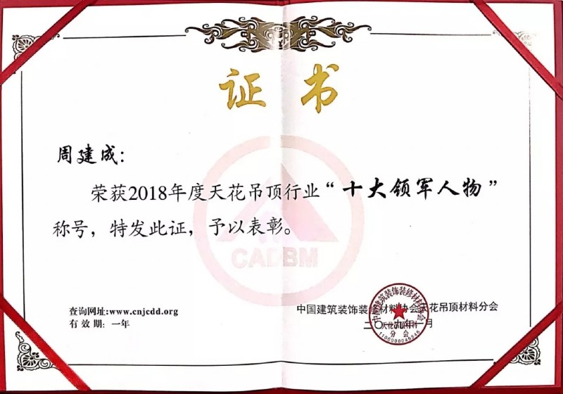 今頂董事長周建成先生當選2018年度天花吊頂行業(yè)十大領(lǐng)軍人物