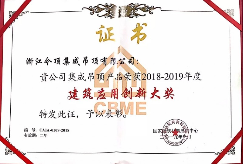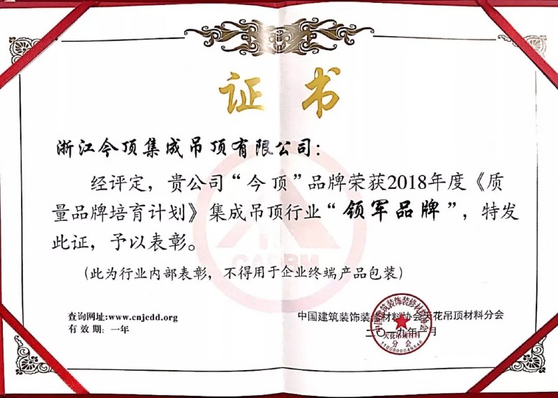 今頂榮獲2018年度集成吊頂行業(yè)領(lǐng)軍品牌