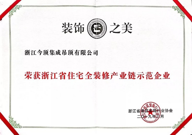 浙江今頂集成吊頂有限公司肩負(fù)行業(yè)重?fù)?dān),積極承擔(dān)社會(huì)責(zé)任,一直秉承讓消費(fèi)者裝修省心、住得安心的信念,再次榮獲“浙江住宅全裝修產(chǎn)業(yè)鏈?zhǔn)痉镀髽I(yè)”榮譽(yù)證書和獎(jiǎng)牌。